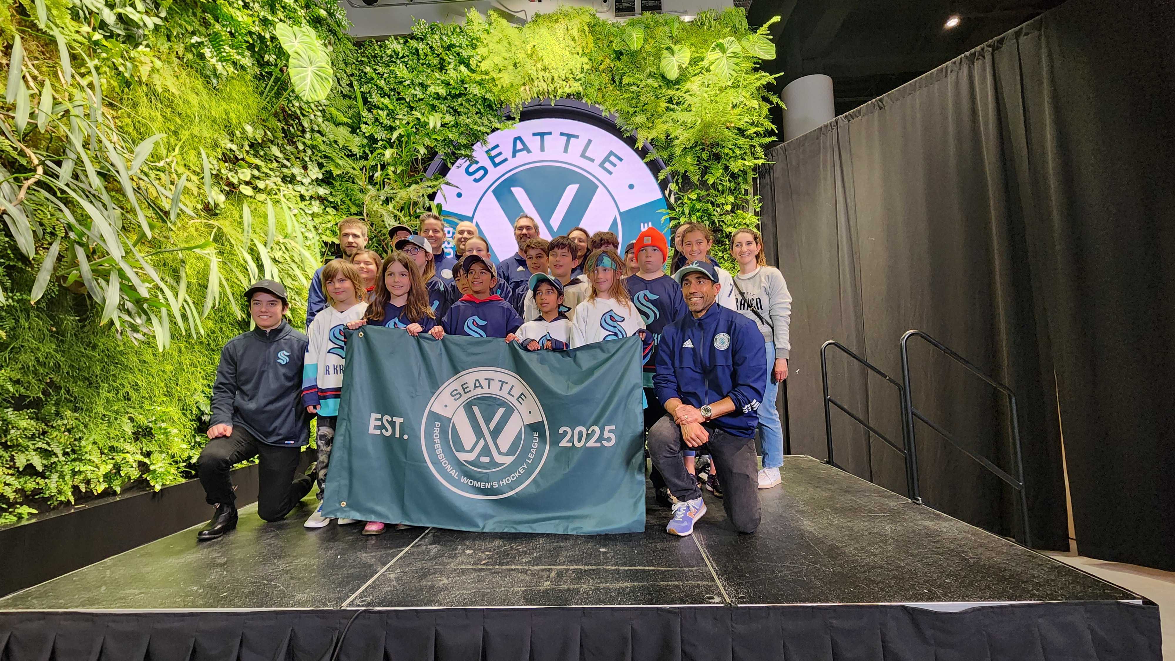 Jr Kraken players and Kraken Hockey League women's players welcomed the new team at the expansion announcement at Climate Pledge Arena.